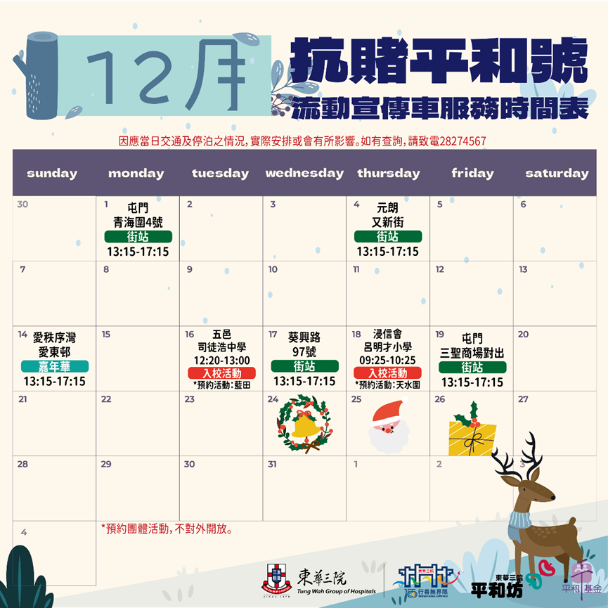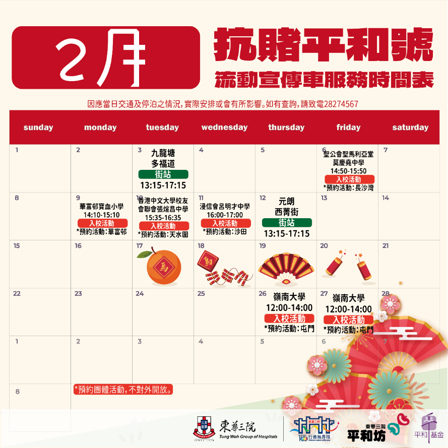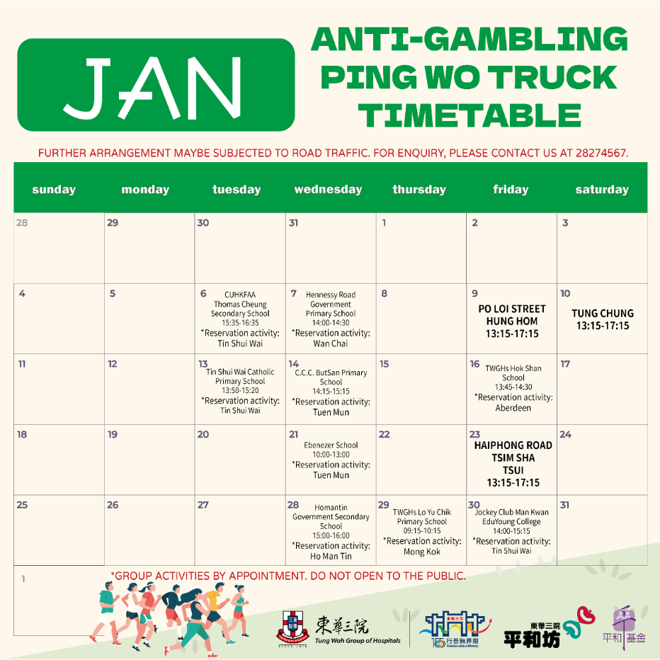 由民政及青年事務局轄下平和基金支持及贊助,東華三院平和坊成立流動宣傳車-「抗賭平和號」,自2018年6月起走訪全港十八區和學校,向市民及學生宣揚抗賭訊息和沉迷賭博的禍害,並及早辨識受賭博問題困擾的人士及家人,提供適時支援。
